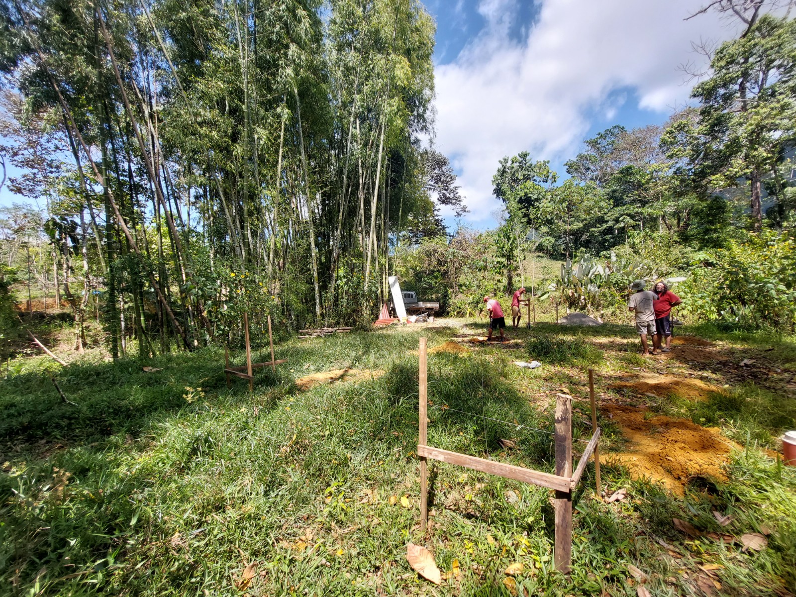 In one of the buildable areas a structure is being started with a roof for wood storage but with potential for residential use.