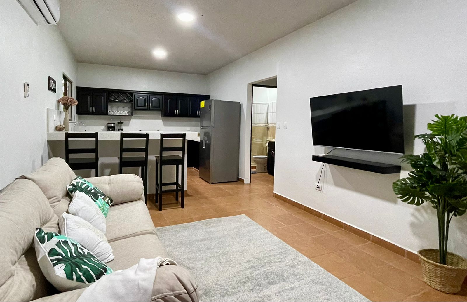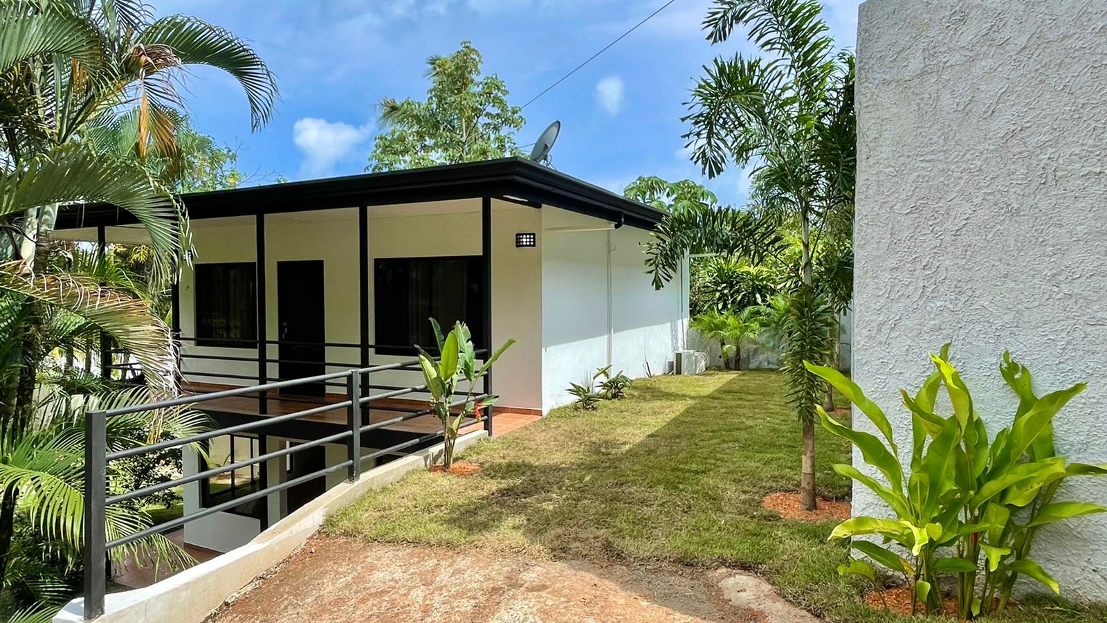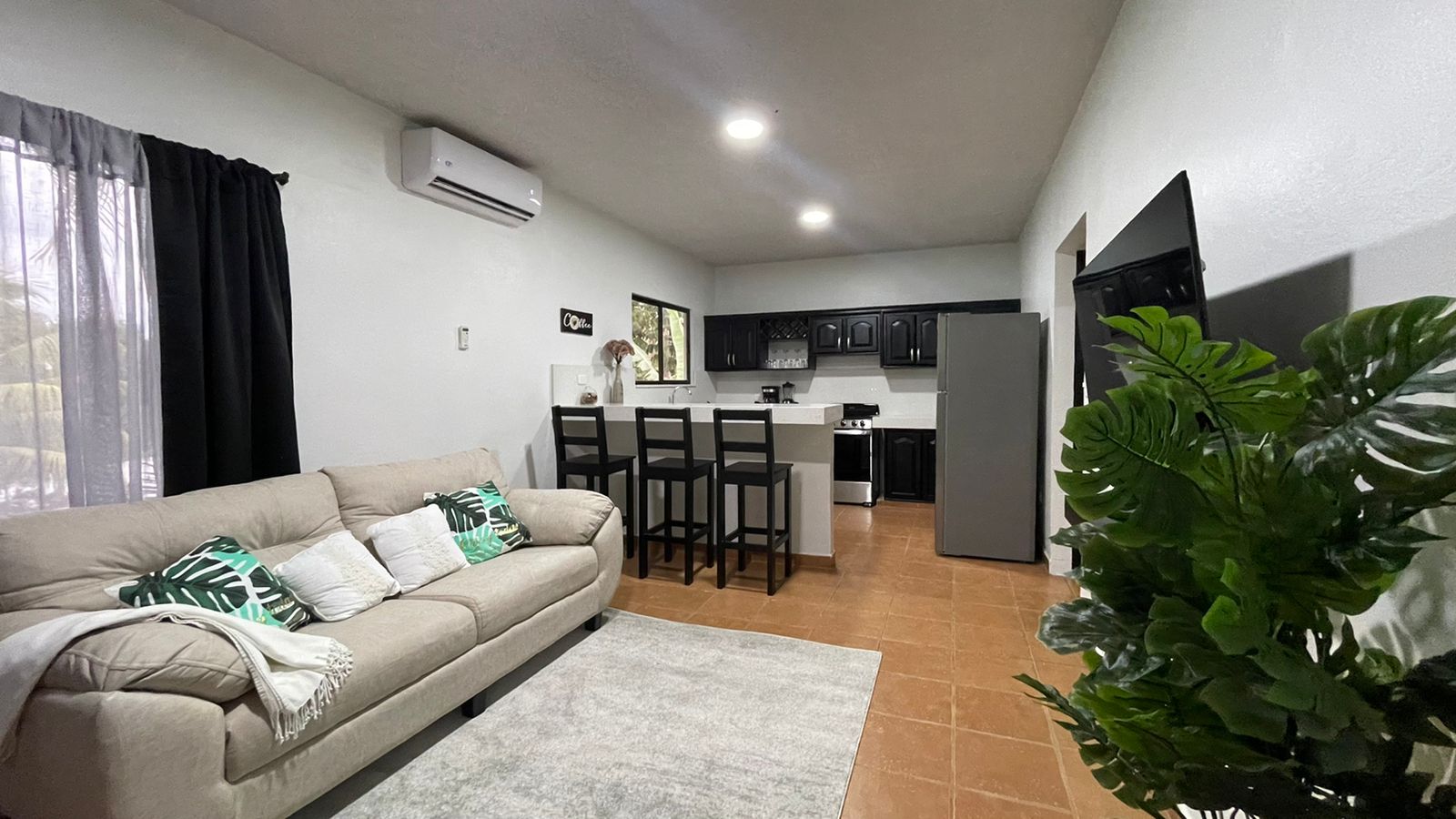 The two newly remodeled apartments are siting on a 872 sq.m lot with a 20 meter long drive way from the main road creating more privacy on this property for you and your clients, yet with the benefits of being on a public road. The two units are identical, a small out door terrace that opens up to the living room with big sliding glass windows, sofa and 50″ TV to entertain everyone in the apartment, the modern white quartz counter tops and the black stain kitchen cabinets look fantastic. The large breakfast nook with 4 bar stools, colonial ceramic tile on the bath rooms and spacious laundry room, very confortable master bedroom with a queen size bed, night table, built in closet and A/C for the hotter days.