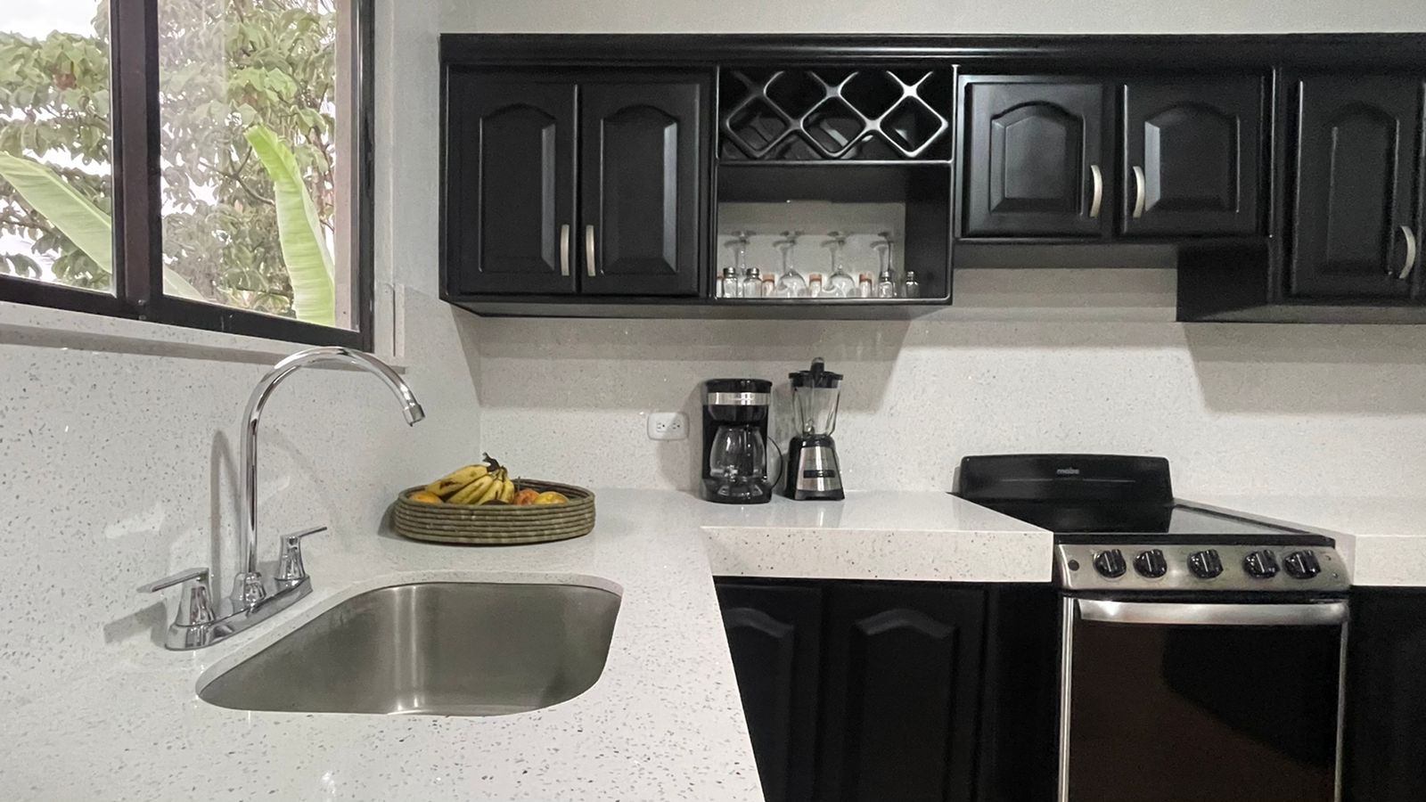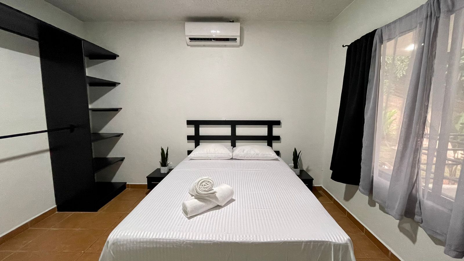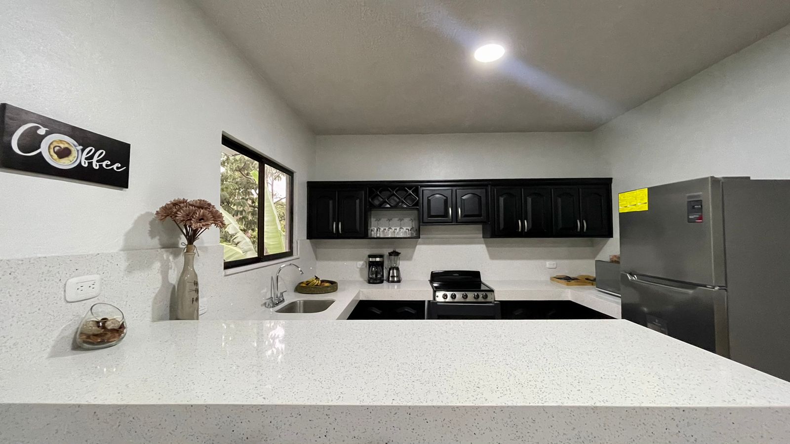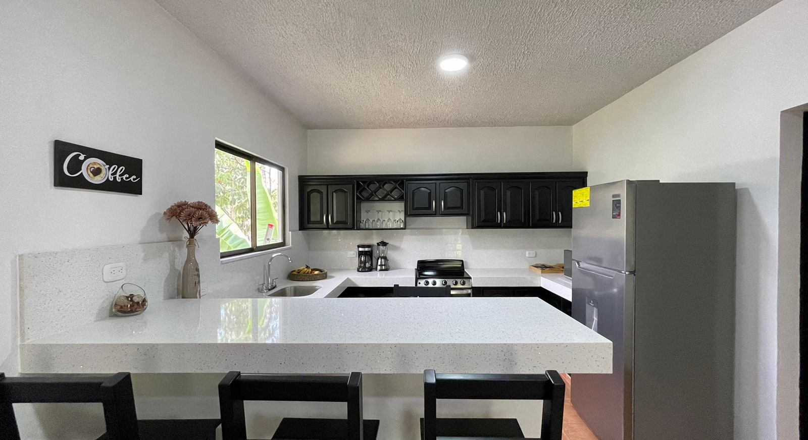 The two newly remodeled apartments are siting on a 872 sq.m lot with a 20 meter long drive way from the main road creating more privacy on this property for you and your clients, yet with the benefits of being on a public road. The two units are identical, a small out door terrace that opens up to the living room with big sliding glass windows, sofa and 50″ TV to entertain everyone in the apartment, the modern white quartz counter tops and the black stain kitchen cabinets look fantastic. The large breakfast nook with 4 bar stools, colonial ceramic tile on the bath rooms and spacious laundry room, very confortable master bedroom with a queen size bed, night table, built in closet and A/C for the hotter days.